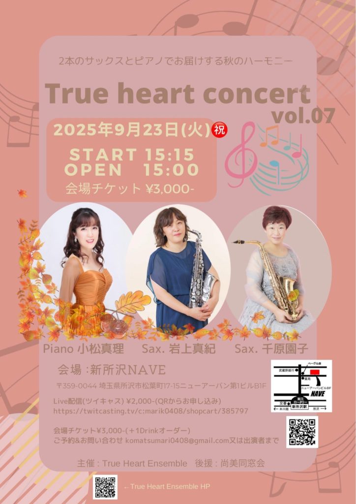 クラシックサックスプレイヤー千原園子と、ジャズサックスプレイヤー岩上真紀、ノンジャンルで何でも弾いちゃうピアニスト小松真理の3人が、あらゆるジャンルの曲を3人のアンサンブルにアレンジして演奏しちゃう、異色ユニット。サックスとピアノ以外に、デジタルサックス、フルート、鍵盤ハーモニカ、カホン、トイグロッケンなど、様々な楽器も演奏する。True heartという名前は、遠くに離れても続いてきた大切な人という、3人の友人関係から名づけた。2022年11月に吉祥寺のサウンズラボさんで初コンサート、これまでに4回のコンサートを行う。コンサートは会場と同時配信で行わている